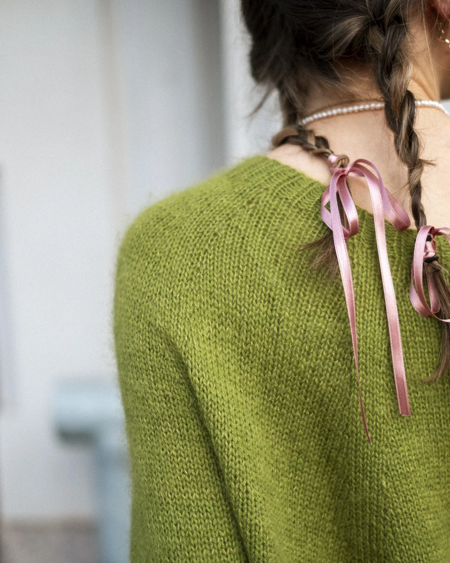 The sweater is worked by holding one strand of merino together with one strand of silk mohair.