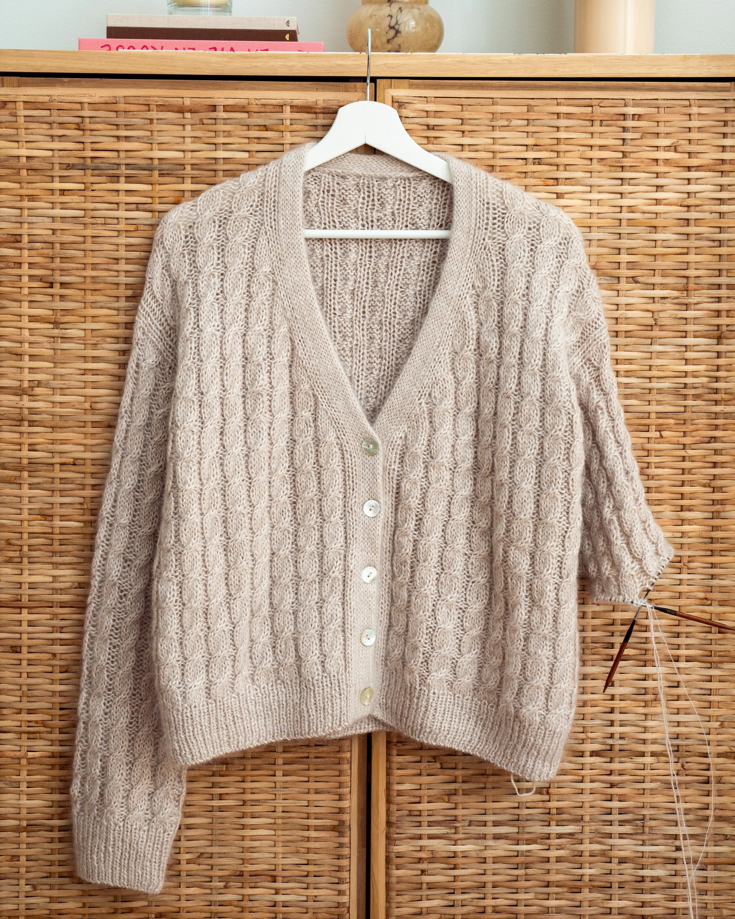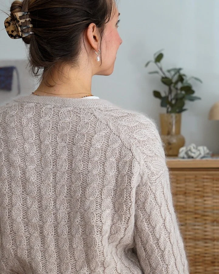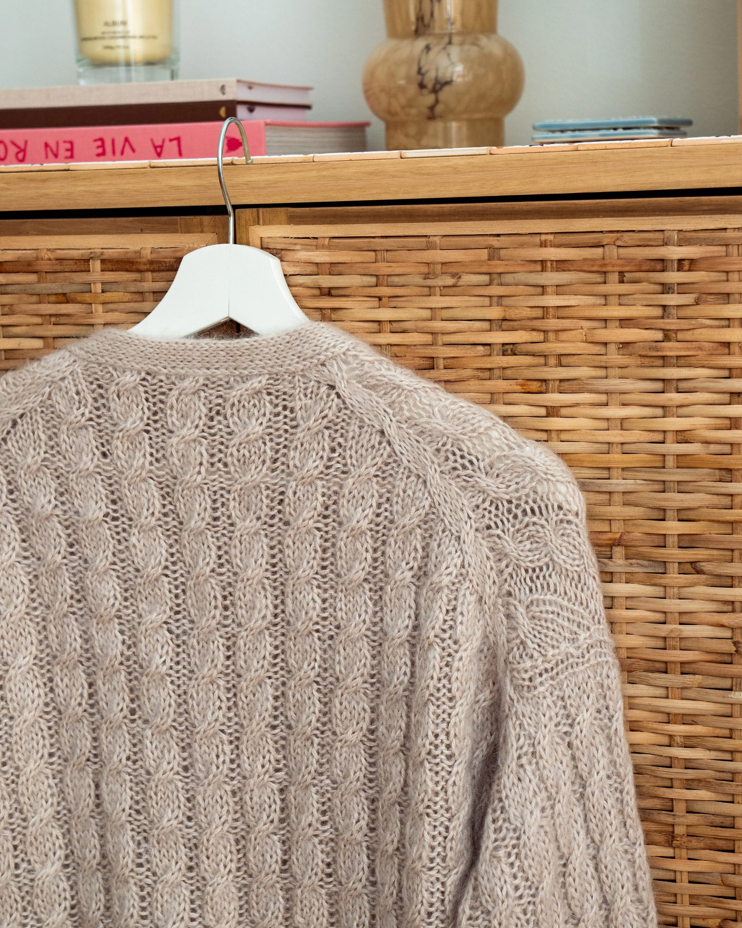 The Sophisticable Cardigan is worked by combining two strands of lace-weight silk mohair yarn together with one strand of fingering weight yarn. This is done to create a light and soft fabric. You can also choose to work the cardigan with just one strand of DK or chunky weight yarn, for example, a blown alpaca or fluffy yarn (e.g Drops Air or Sandnes Garn Borstet Alpaca).