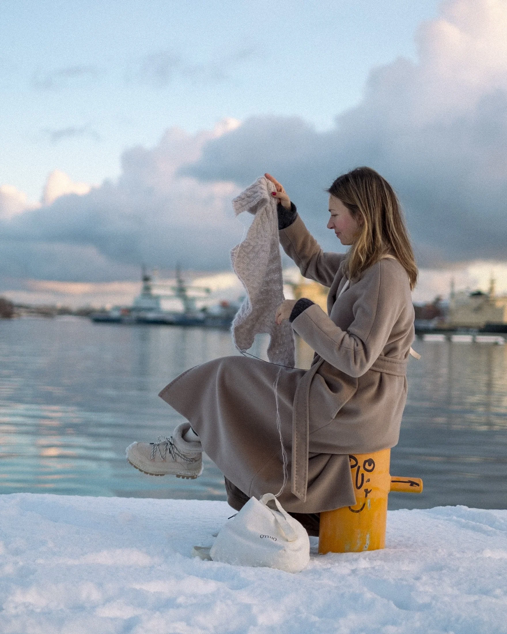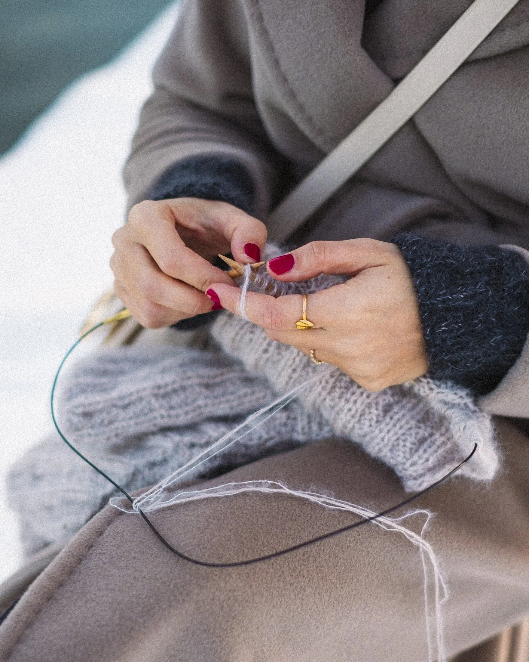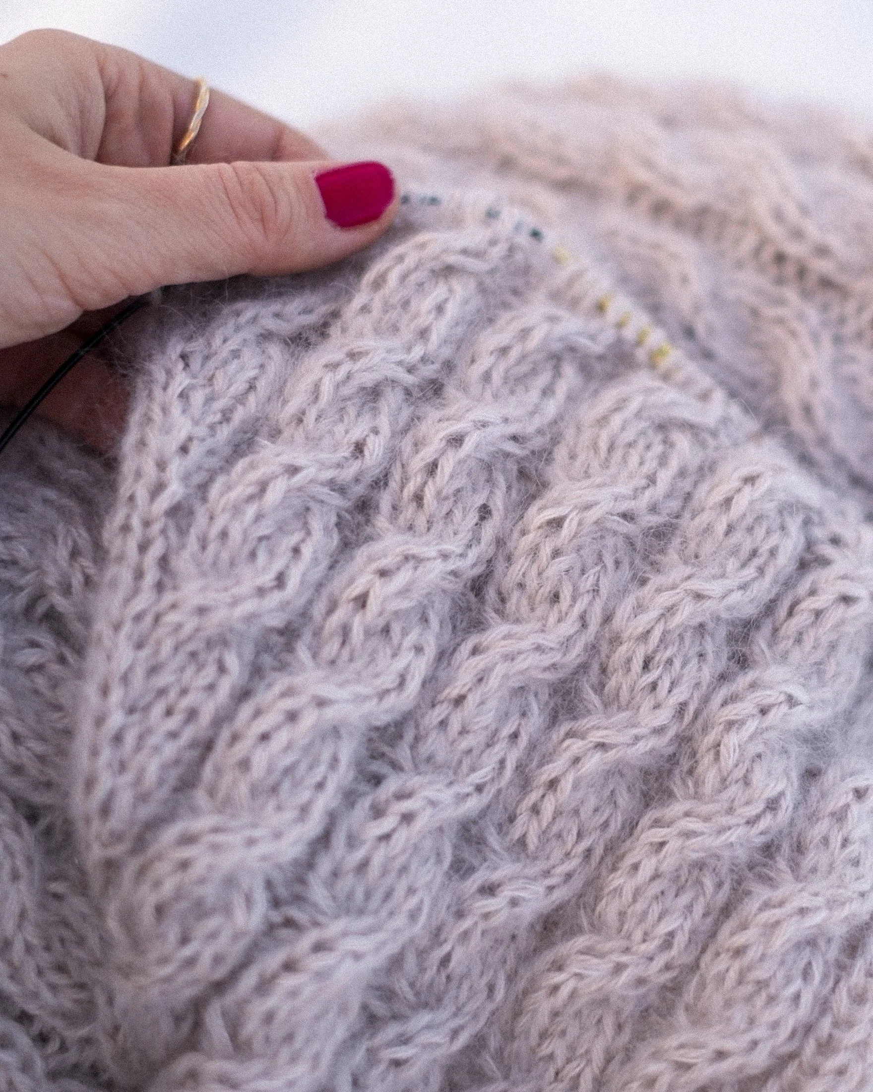 The Sophisticable Cardigan is worked by combining two strands of lace-weight silk mohair yarn together with one strand of fingering weight yarn. This is done to create a light and soft fabric. You can also choose to work the cardigan with just one strand of DK or chunky weight yarn, for example, a blown alpaca or fluffy yarn (e.g Drops Air or Sandnes Garn Borstet Alpaca).