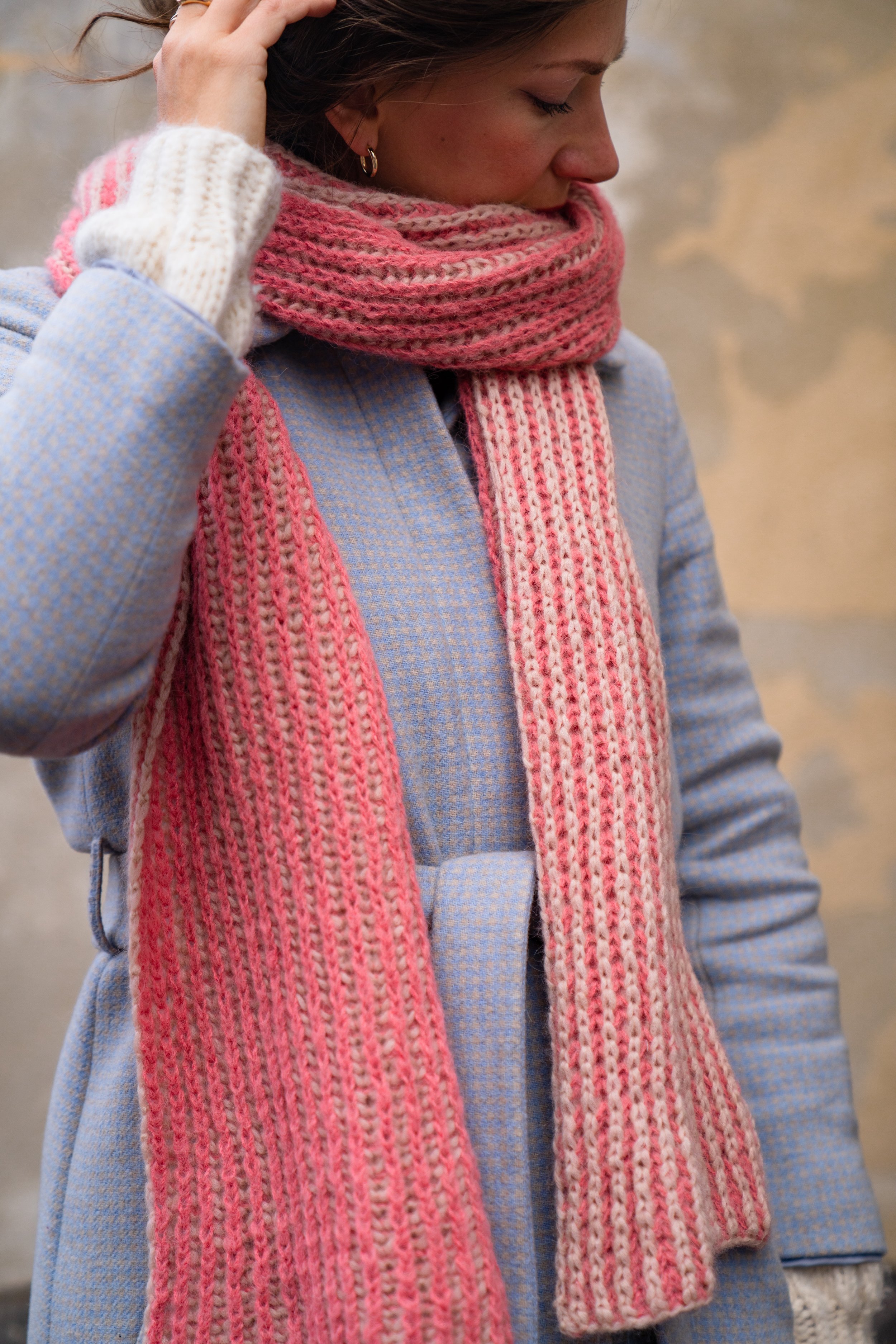 213 sts x 17 rows = 10 x 10 cm / 4 x 4” in two color brioche on 4.5 mm (US7) needle, before blocking.