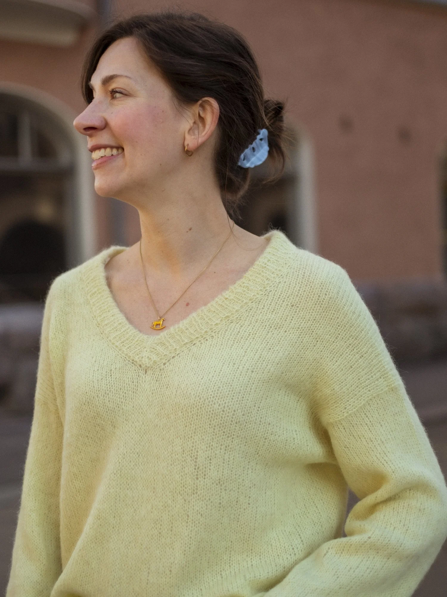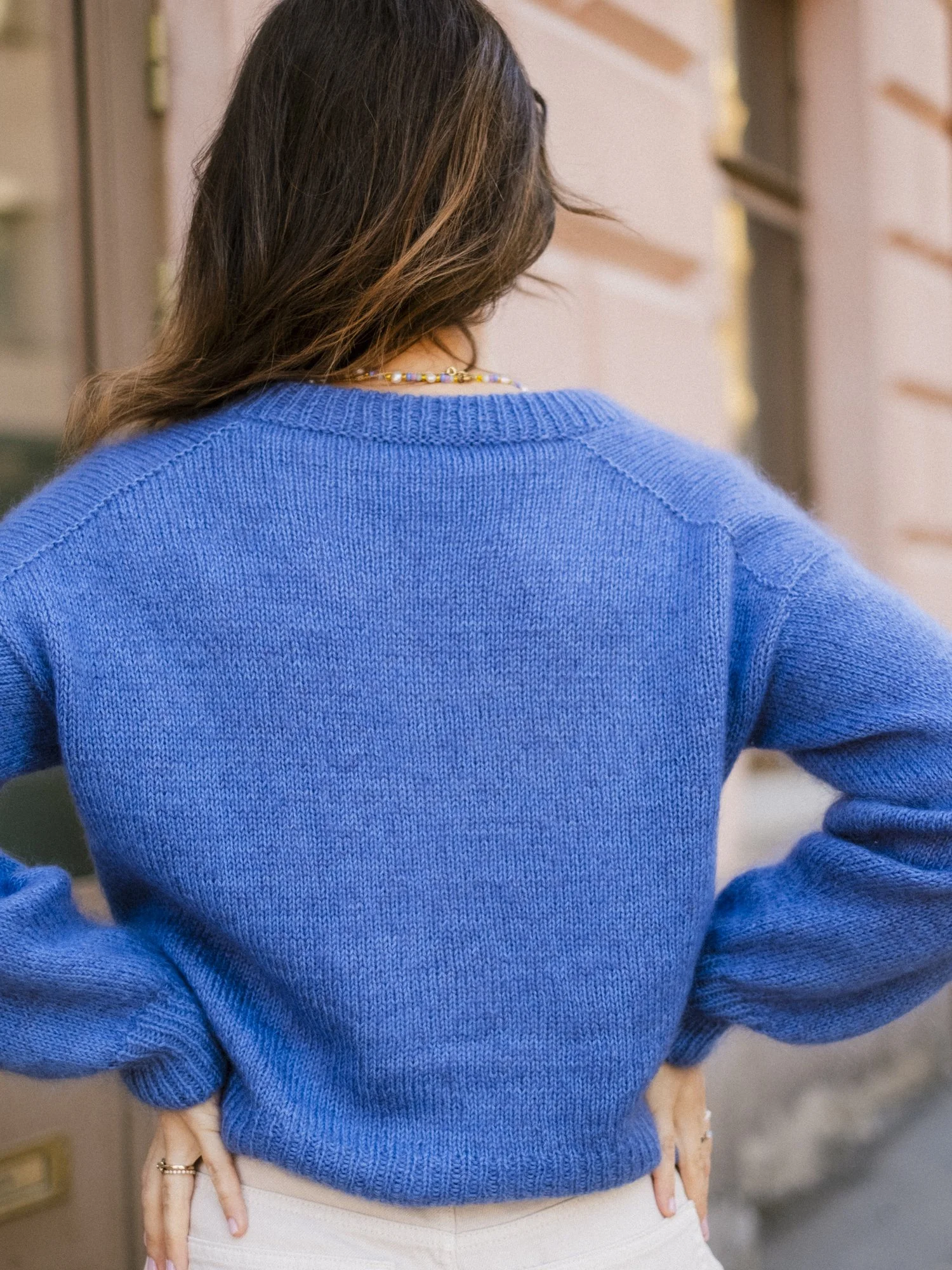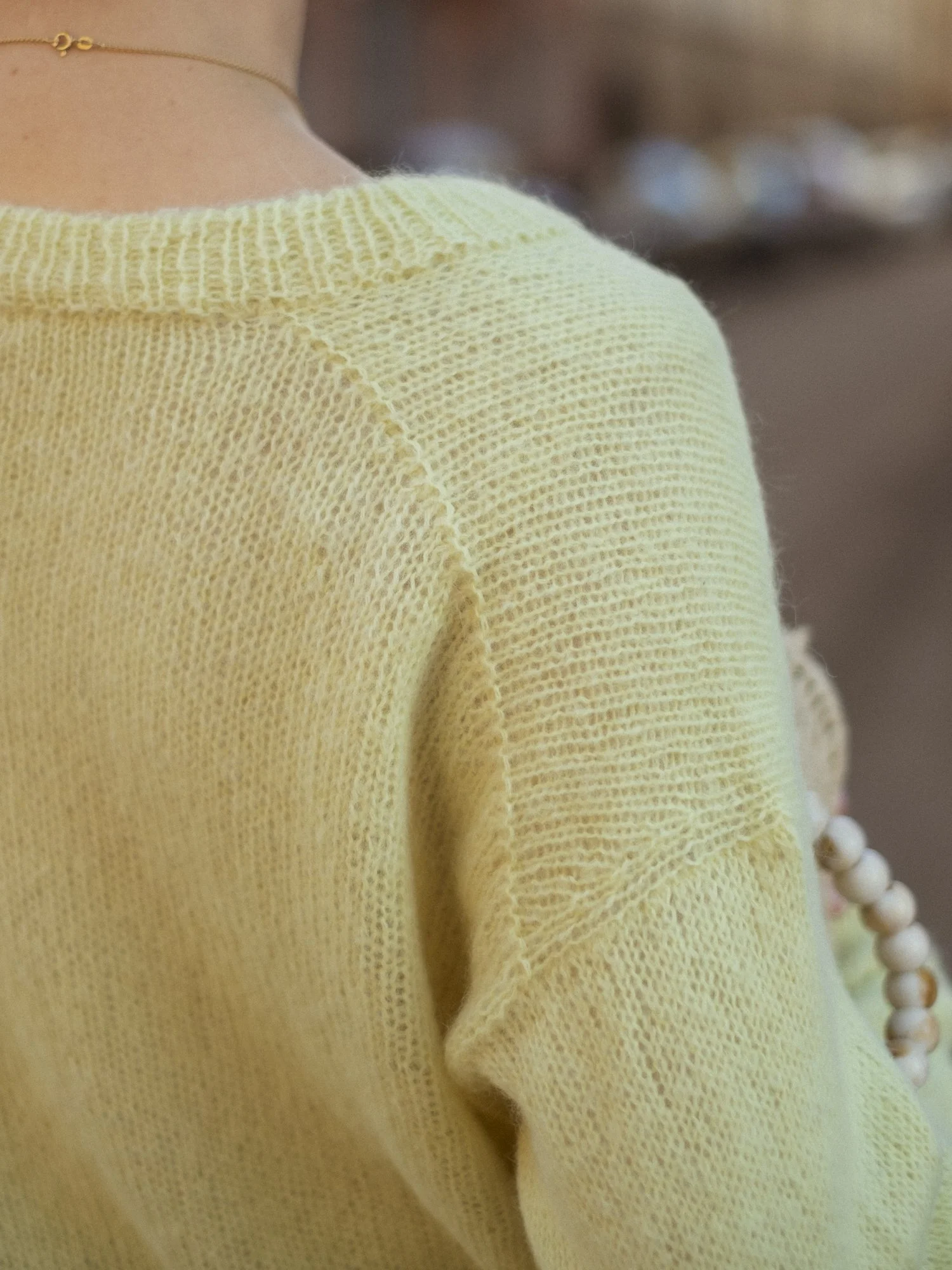 Das graue Model wurde mit einem Faden Alpaka-Seide und einem Faden Mohairzusammengehalten gestrickt.
