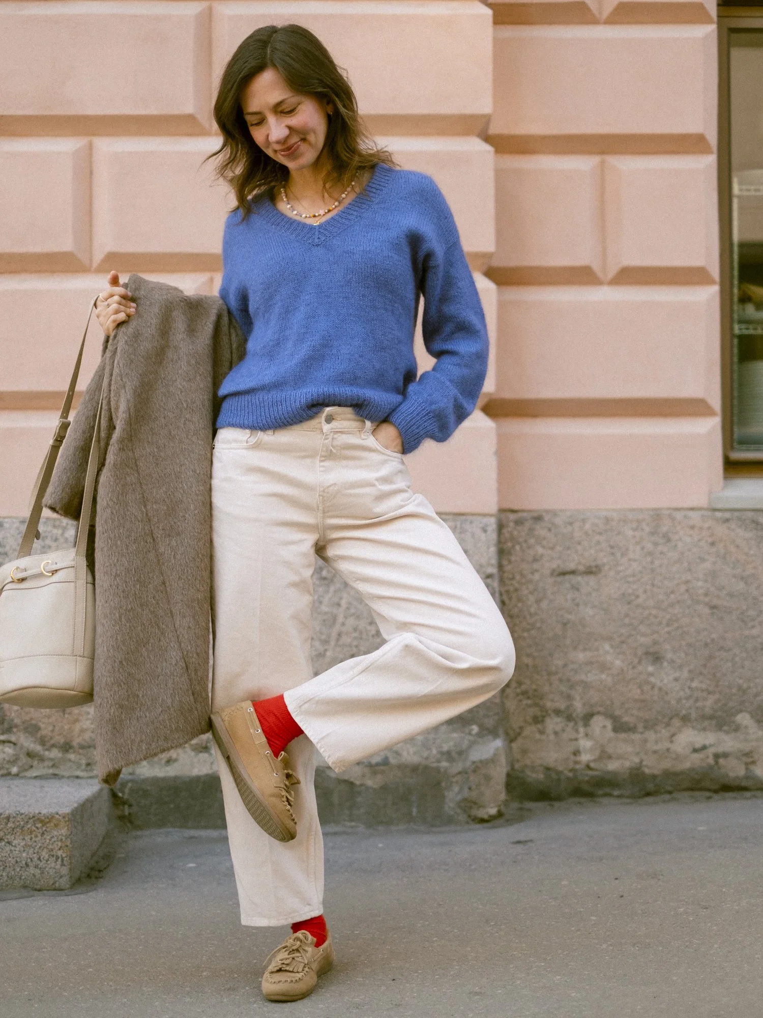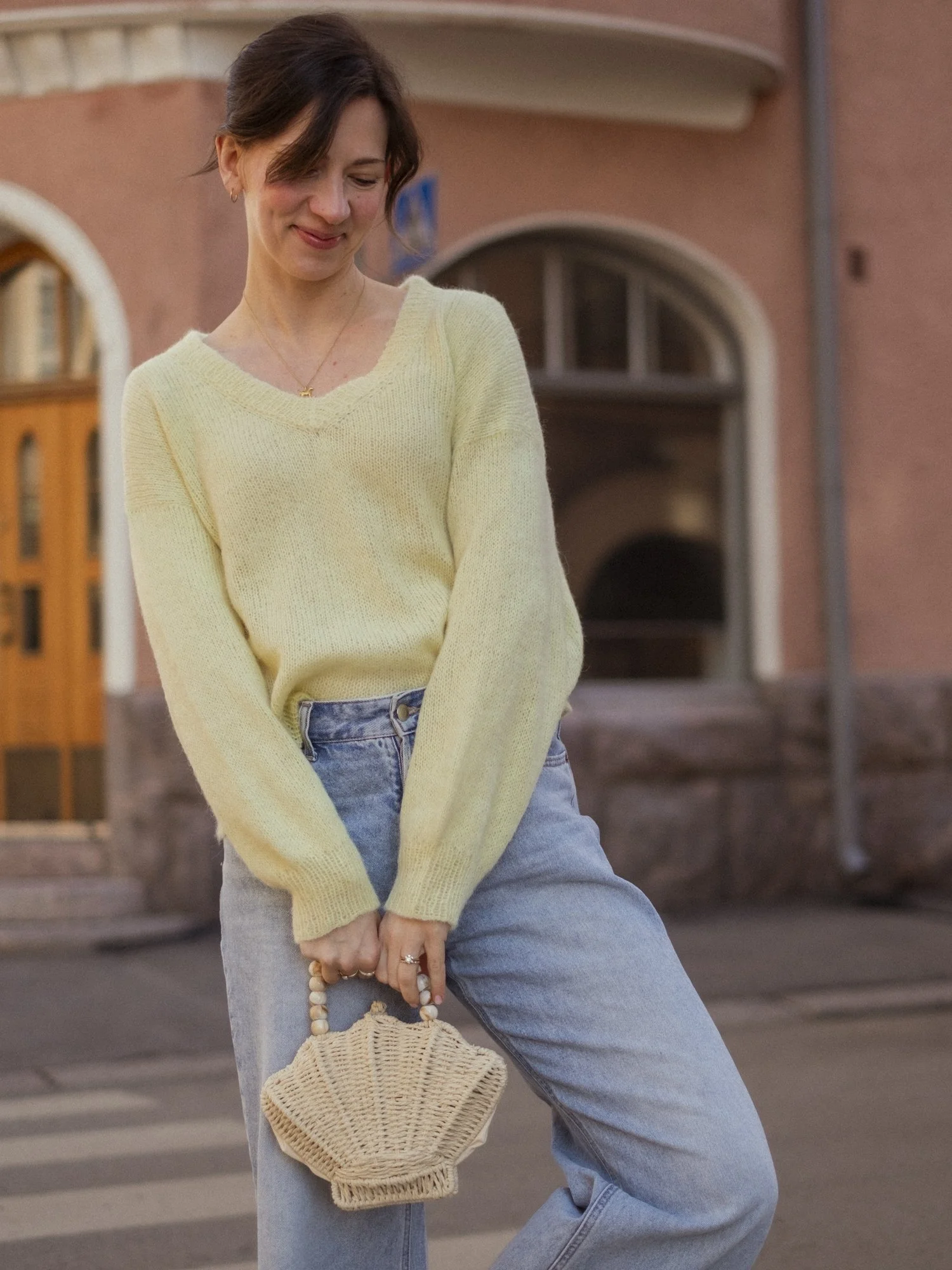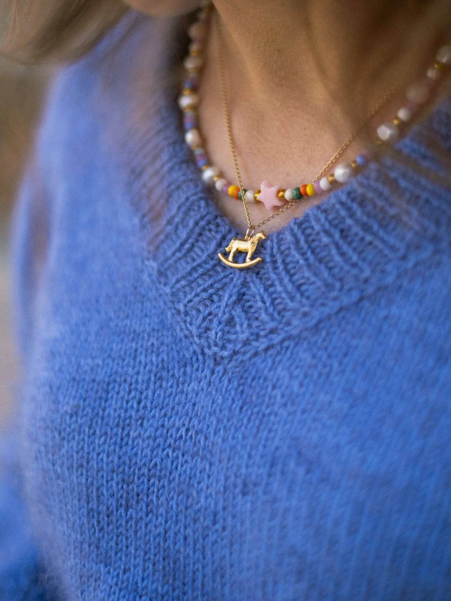 Das graue Model wurde mit einem Faden Alpaka-Seide und einem Faden Mohairzusammengehalten gestrickt.