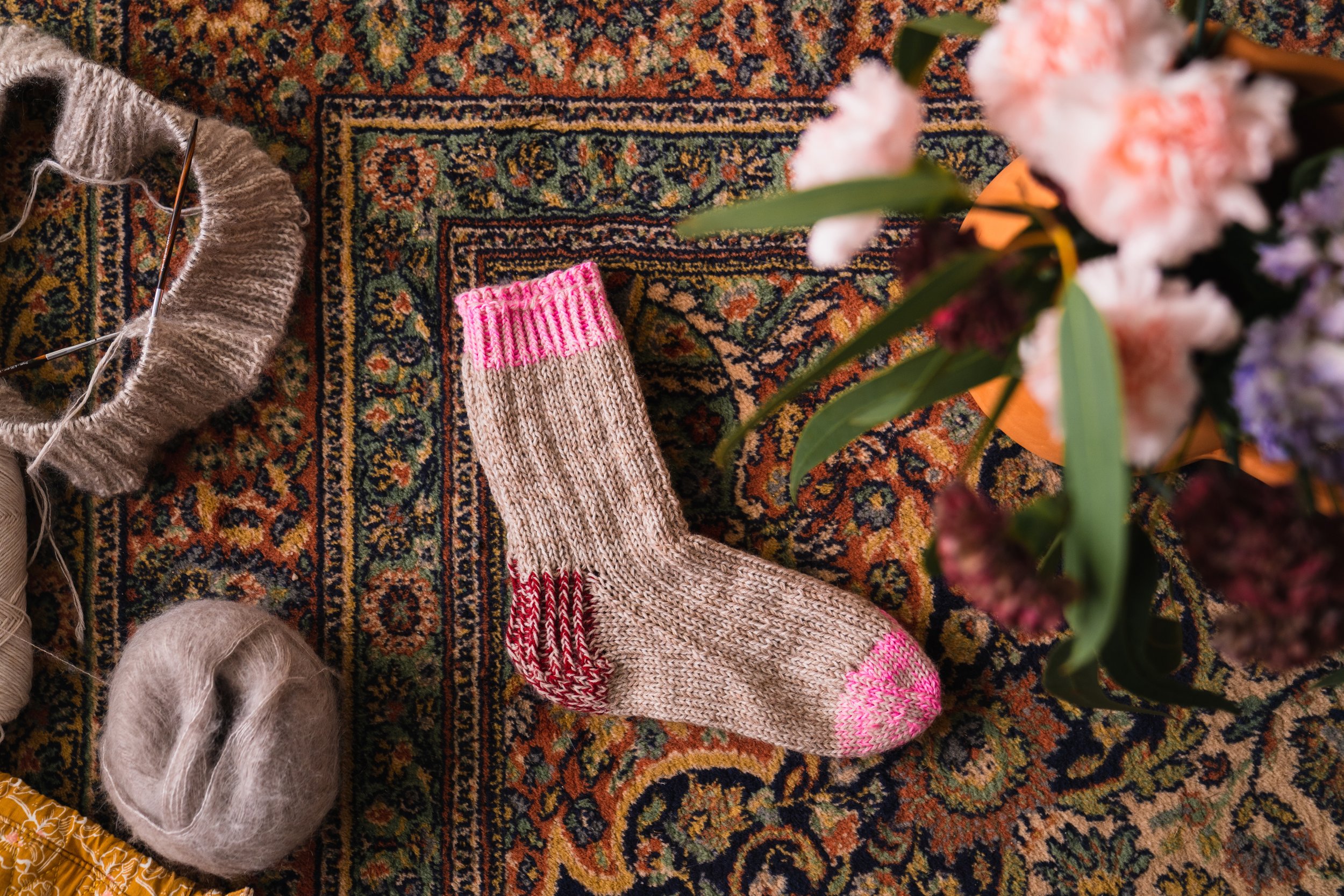 50 g (in total for two socks) of Filcolana Arwetta Classic (80% merino wool, 20% nylon - 210 m / 230 yds / 50 g) in color Marzipan melange 977 held together with 40 g of Filcolana Arwetta Classic in color Sand melange 971.