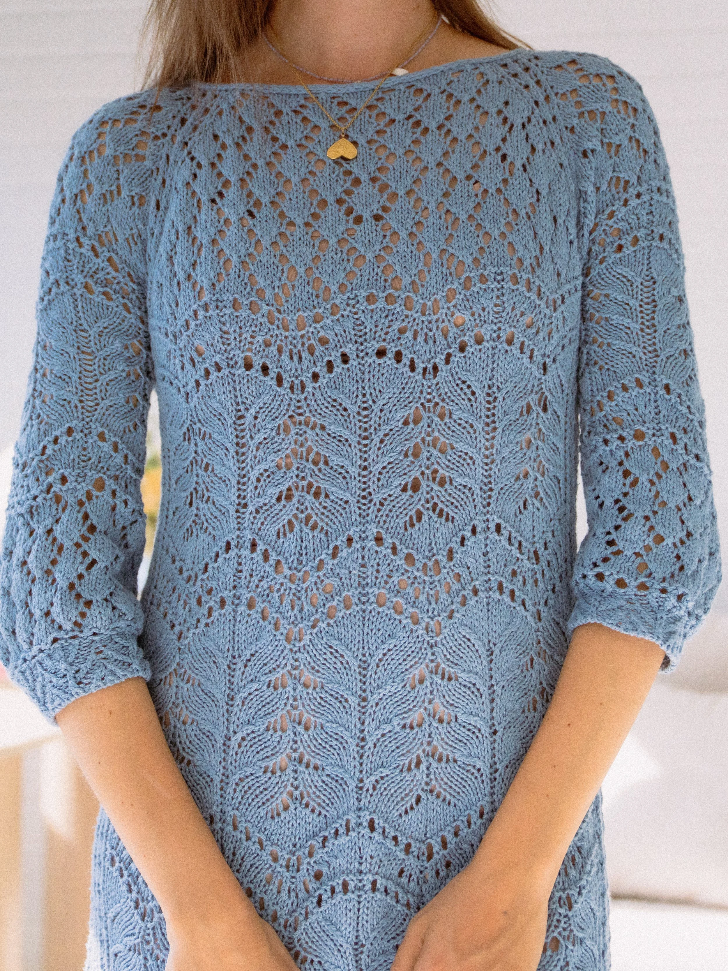 The dress can be worked in one strand of DK weight yarn, or by holding two strands of fingering weight yarn together.