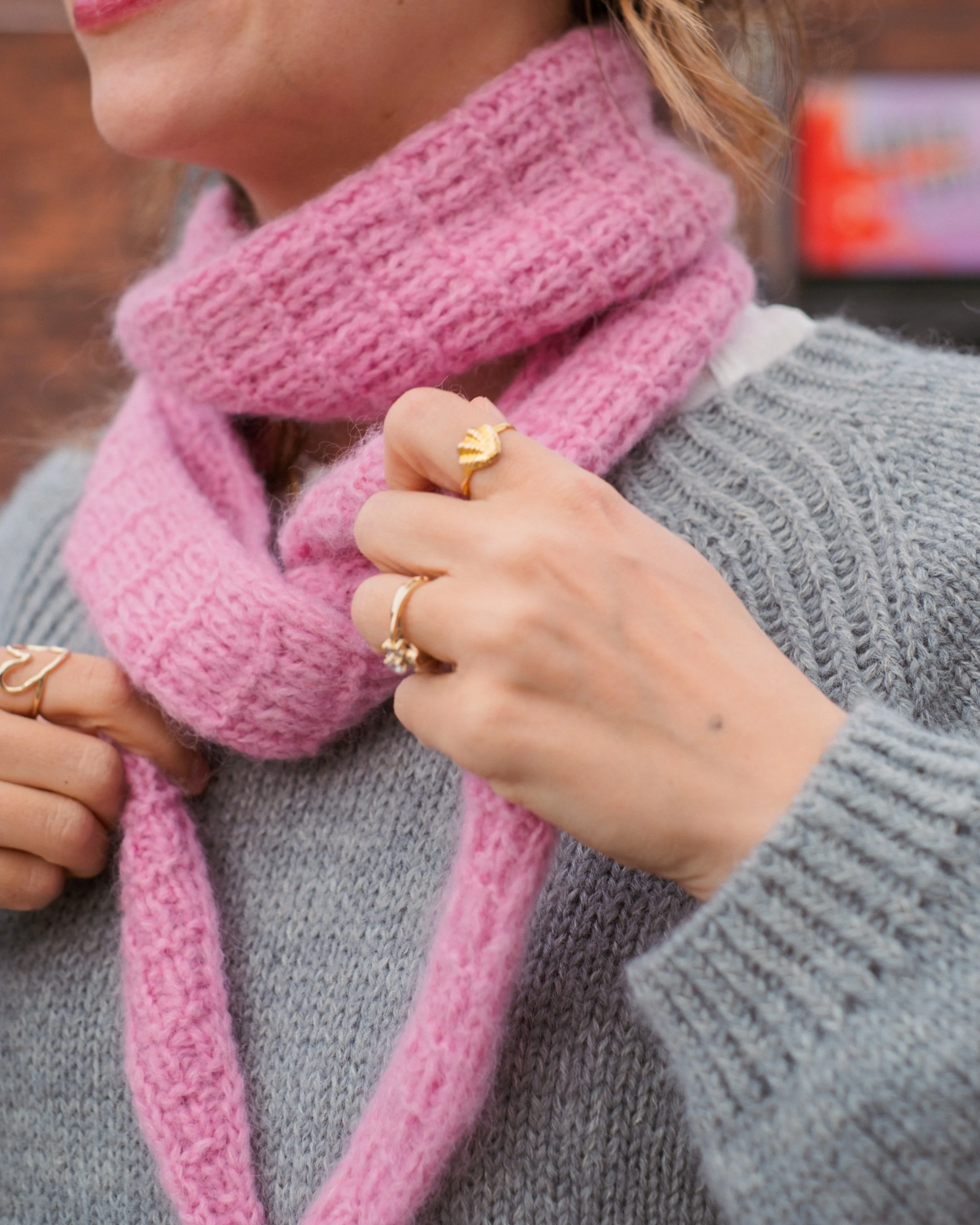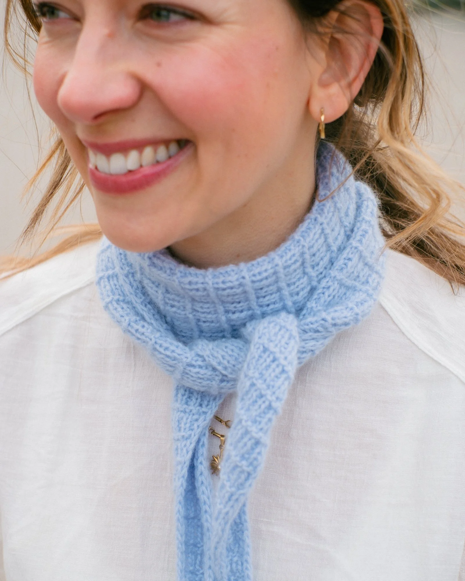 The scarf can be worked with a strand of DK weight yarn, or by holding two strands of lace or fingering weight yarn together. You need approx.: